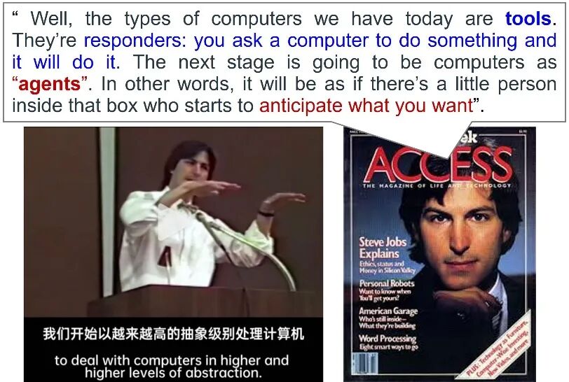 进一步发展到“Agent 即服务”阶段,自主服务智能代理将呈现出指令式计算架构中没有的软件形态。垂直智能代理不限于被动执行预设任务,而是能自主发现任务、调度资源、持续与环境互动。此外,与传统软件只能调用预定义函数、基于固定的 UI 不同,Agent 可以借助AI编码能力,在线、动态地创建任务所需的新工具,甚至即时构建新的垂直智能代理,并根据具体任务需求实时生成相应的用户界面。 通过以上对比,我们可以看到,智能计算正沿着与指令式计算高度平行的路径,构建起“大模型-AgentOS-垂直智能代理”的三层技术架构。这一架构将为实现更复杂、更自主的智能能力提供坚实的技术底座。 从人机关系的演化看 AI Agent 软硬件形态的发展 在前两部分,我们分别参照了生物智能和计算架构的演化路径,粗略分析了 AI Agent 能力发展和技术实现的方向。这一部分将从人机关系的演化出发,更具体地讨论 AI Agent 将以什么样的形态呈现。 未来很难预测。因此,我们先确定一个人机关系演化的基本原则,基于此构建思考框架,再从这个框架出发,展开对终端设备、操作系统和应用软件形态的具体讨论。 原则:在越来越抽象的层面满足人类需求 乔布斯在 40 年前对计算机的发展做过总结:“过去 20 年里,我们在越来越高的抽象级别使用计算机”。最初通过打孔纸带和按钮的机器语言处于最底层,是完全适应机器的二进制码;汇编语言虽然与机器码一一对应,但具备了一定的语义,编程变得相对容易;高级语言则更接近人类的自然语言,具备更高的表达能力和效率。