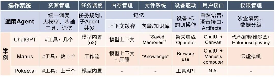 2.操作系统(AgentOS)拥有了强大的计算元件(CPU)或模型基座(大模型)后,其上一层是操作系统:负责资源调度、屏蔽底层复杂性和承接上层应用。在指令式计算和智能计算的演进中,都能看到一个相似的“中间层”的发展,扮演着释放底层能力和支持上层应用的关键角色。 在智能计算架构中,AgentOS 的角色正由通用 Agent 来承担(或者是通用 Agent 的发展目标):作为连接大模型和垂直 Agent 的中间层,正逐步承接传统操作系统的核心职能。可以从以下六个方面,看到二者的结构性对应: