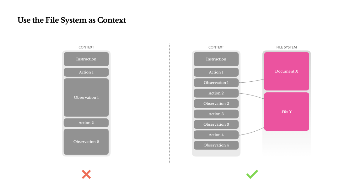 这就是为什么我们在 Manus 中将文件系统视为最终上下文(file system as the ultimate context):大小不受限制,本质上持久,并且可由智能体本身直接操作。模型学会按需读写文件——使用文件系统不仅作为存储,而且作为结构化的外部化内存。