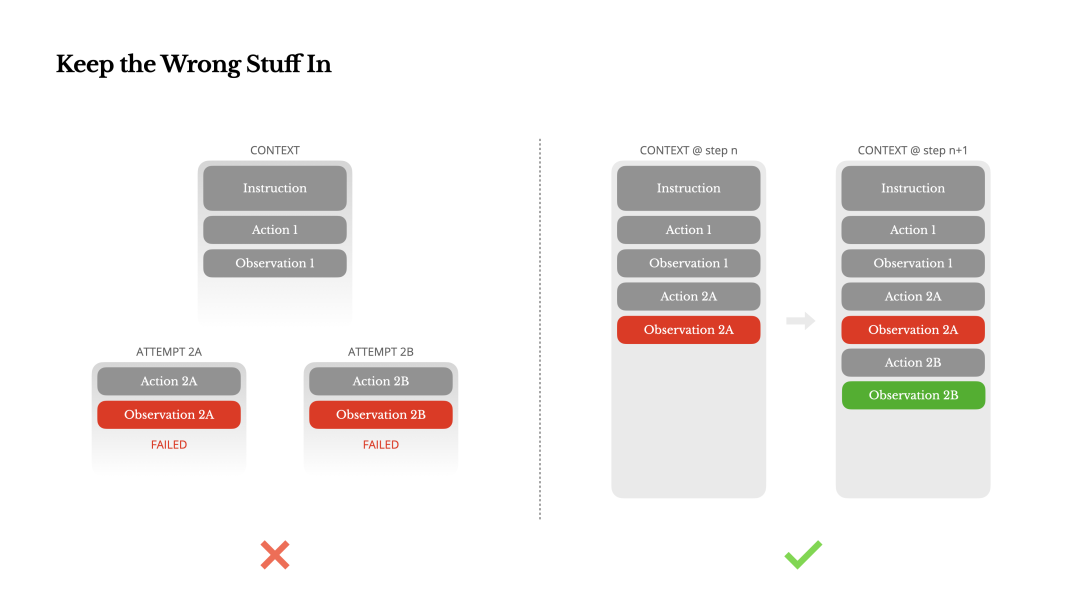 将错误保留在上下文中(leave the wrong turns in the context)。