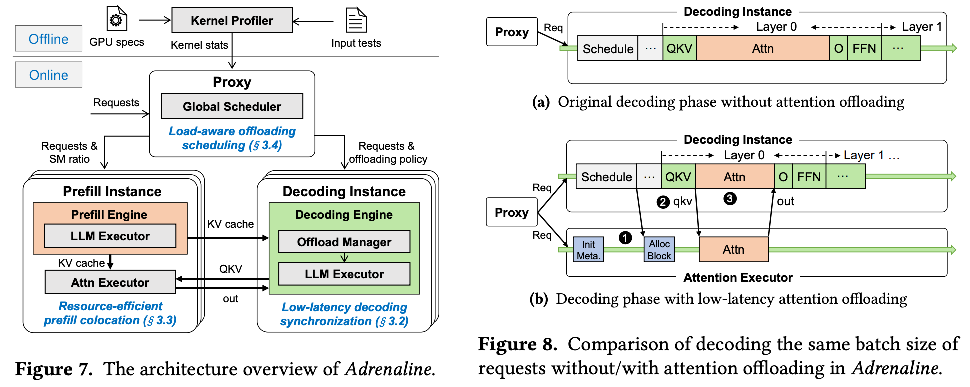除了直接将 Attention 分离外,如下图 Figure 7 和 Figure 8 所示,[2503.20552] Injecting Adrenaline into LLM Serving: Boosting Resource Utilization and Throughput via Attention Disaggregation将 Decoding 阶段中 Memory Bound 的 Attention 计算部分 Offload 到 Prefill GPU 上执行,从而: