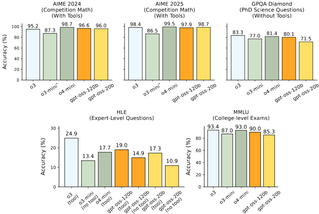 gpt-oss-120b 在竞赛编程 (Codeforces)、通用问题解决 (MMLU 和 HLE) 以及工具调用 (TauBench) 方面表现优于 OpenAI o3‑mini,并与 OpenAI o4-mini 持平或超越其性能。