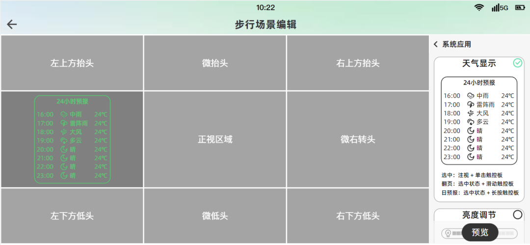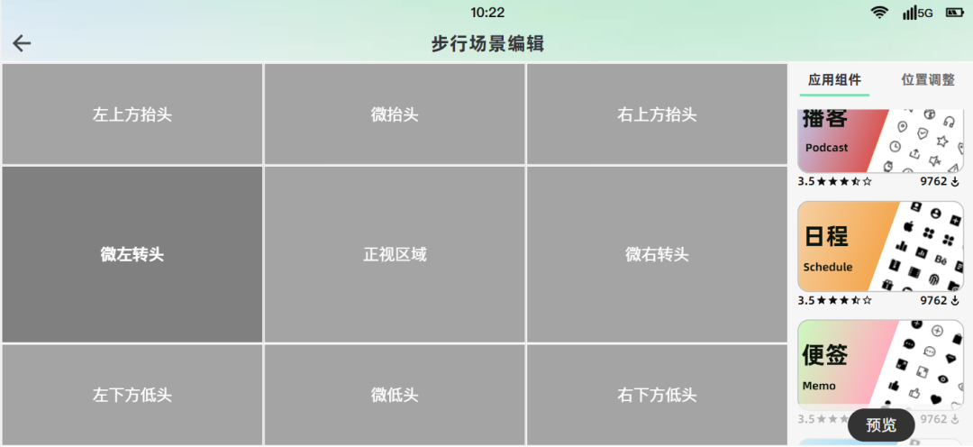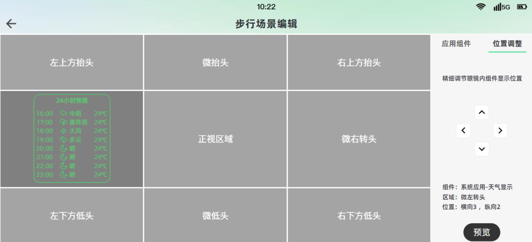 用户进入场景模块后,可以自行创建所需的场景,也可以对已有的“系统”场景进行调整,信息调整完成之后将设置信息同步到眼镜端。对一个新场景或已有场景进行编辑时,点击之后便会进入场景编辑模式(如下图)。由于眼镜在3Dof模式下可以比较清晰的识别抬头低头和左右转头这两组动作,因此可以对如下这9个区域进行显示设置,点击显示区后,该区域会变色提示选中,此时可以点击右侧“应用组件”来选取需要显示的信息了。
