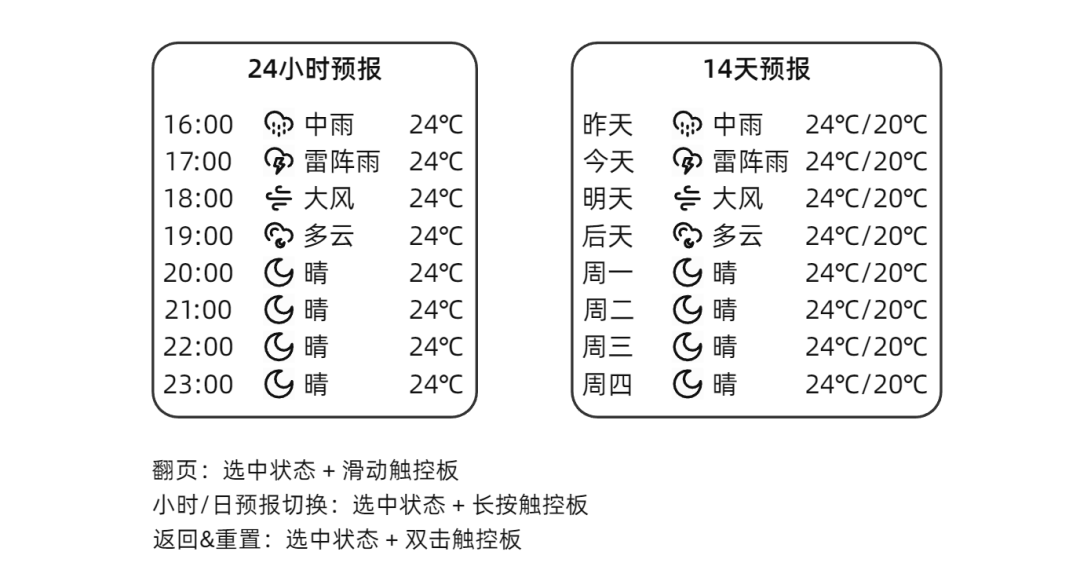 天气预报数据接口一般会支持24小时小时预报和14天日预报,由于尺寸限制需要进行翻页或者滚动操作,这时可以在选中状态下滑动来实现翻页滚动,小时预报和日预报的切换也可以通过在选中状态下长按来去实现。
