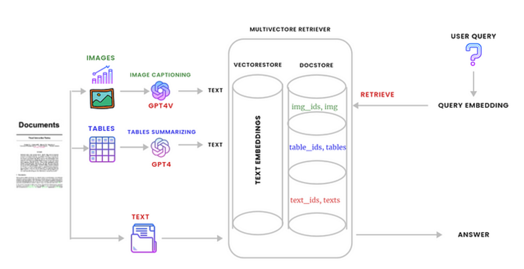 为了总结表格,我们将使用 Langchain 和 GPT-4。为了生成图像标题,我们将使用 GPT-4-Vision-Preview。这是因为它是目前唯一可以同时处理多个图像的模型,这对于包含多个图像的文档非常重要。对于文本元素,在将它们放入嵌入之前,我们将保持它们不变。