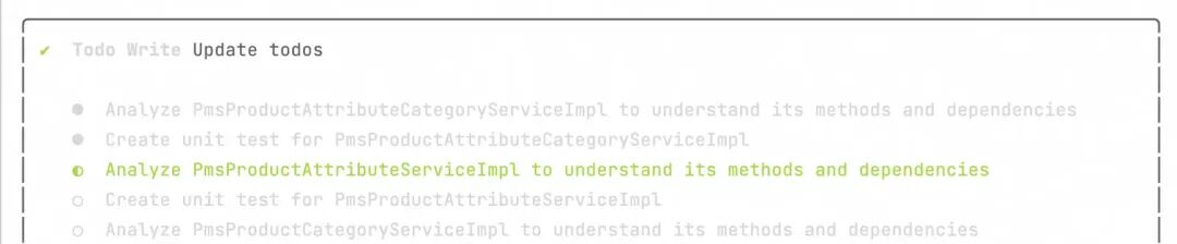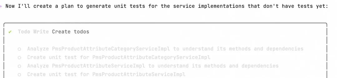 通过 Model Context Protocol (MCP) 服务器发现的工具,注册为 DiscoveredMCPTool 实例。其中MCP的配置是通过在本地配置的settings.json文件进行MCP服务查询,然后动态请求添加进去。 在运行时动态发现,功能和实现由用户定义的命令决定,这里不在赘述。 如上文所述,在复杂的软件开发场景中,许多关键任务往往跨越多个会话、涉及多个环节,并可能持续数小时乃至数天。通过TodoWriteTool机制,不仅实现维护动态任务清单,更承担着状态同步、进度追踪与智能辅助决策三大核心职能。通过结构化任务上下文与阶段性目标管理,它有效弥补了AI在有限上下文窗口下的记忆短板,确保无论对话如何演进,AI始终聚焦核心目标,持续推动任务向正确方向前进。 以批量生成单测任务为例,qwen-code会将相关认为在执行前进行规划,创建Todo列表进行跟踪执行。