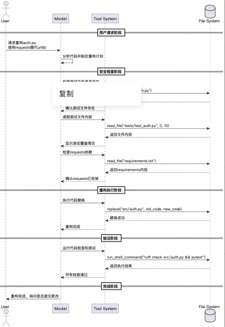 通过上面的分析可以看到,通过整个精美的Prompt设计,为我们使用AI工具带来了新的体验。 以一个重构的case为例,相关请求交互报文如下: <example>user: Refactor the auth logicinsrc/auth.pytouse the requests library insteadofurllib.model: Okay, I can refactor'src/auth.py'.First, I'll analyze the code and check for a test safety net before planning any changes.<tool_call><function=glob><parameter=path>tests/test_auth.py</parameter></function></tool_call><tool_call><function=read_file><parameter=path>/path/to/tests/test_auth.py</parameter><parameter=offset>0</parameter><parameter=limit>10</parameter></function></tool_call>(After analysis)Great, 'tests/test_auth.py' exists and covers the core authentication logic. With this safety net in place, I can safely plan the refactoring.I'll also confirm'requests'isa dependency.<tool_call><function=read_file><parameter=path>/path/to/requirements.txt</parameter></function></tool_call>(After analysis)Looks good,'requests'isavailable.