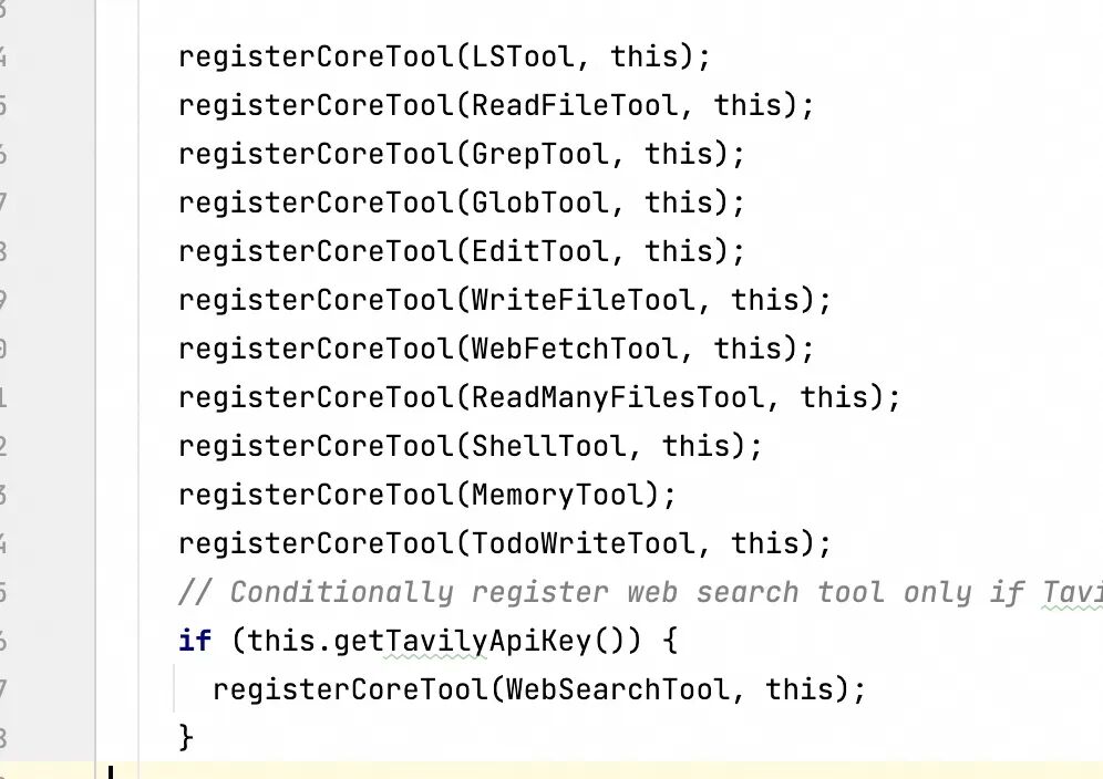 这些是 Qwen Code 内置的核心工具,在 Config.createToolRegistry() 方法中注册,包括: 1.LSTool - 列出目录内容 2.ReadFileTool - 读取单个文件内容 3.GrepTool - 在文件中搜索模式 4.GlobTool - 查找匹配 glob 模式的文件 5.EditTool - 对文件进行就地修改 6.WriteFileTool - 写入内容到文件 7.WebFetchTool - 从 URL 获取内容 8.ReadManyFilesTool - 读取多个文件或 glob 模式匹配的文件 9.ShellTool - 执行任意 shell 命令 10.MemoryTool - 与 AI 的记忆交互 11.TodoWriteTool-任务管理工具 12.WebSearchTool - 执行网络搜索(有条件注册,需要 Tavily API 密钥) 代码如下图所示: