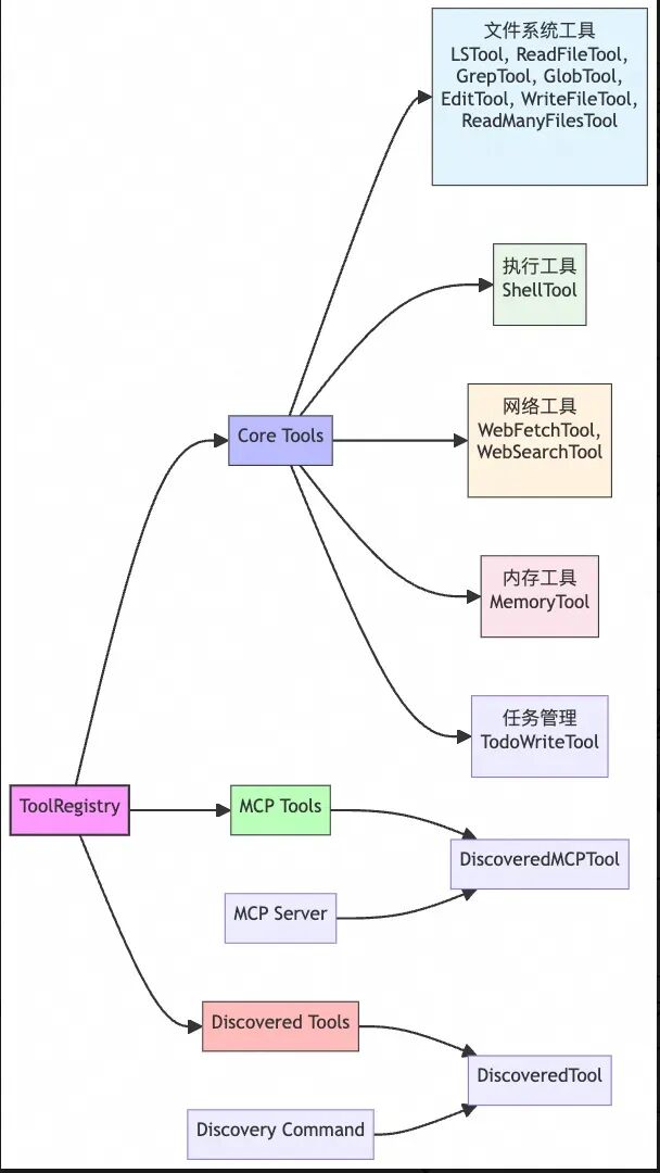 在上面的步骤会生成CoreSystemPrompt,下一步就是追加工具相关描述。工具相关实现都在工具主要在ToolRegistry进行统一注册。目前主要注册了三类工具,整体结构如下: