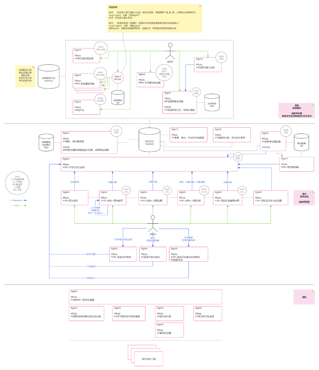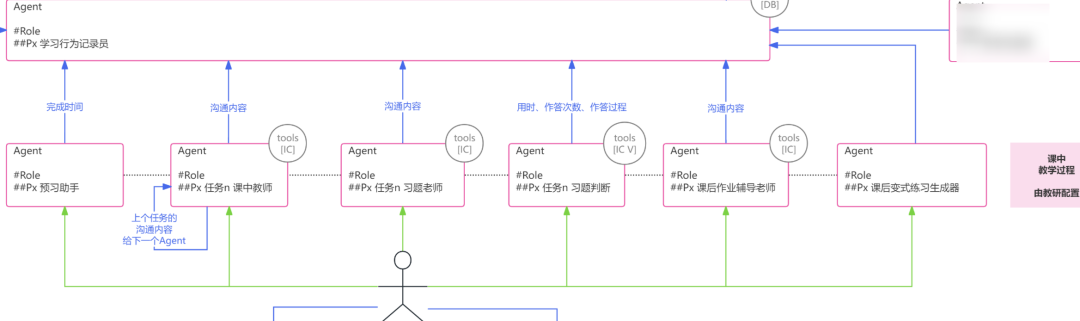 学生在上课过程中,可以和不同环节的 Agent 交流,每个 Agent 各司其职,其背后的行为、工具、记忆都包含了 Agent 设计者的智能,所以可以更好地帮助学生。因为和 Agent 的交流过程被记忆,所以为有据可依的半自动/自动化的形成性/总结性评价都做好了准备工作,甚至为下节课的因材施教、自动化推荐都做好了准备:学生在课后可以得到由 Agent 设计的针对性练习题,下节课前的预习材料可因人而异。这些环节数据是学生宝贵的数据资产。