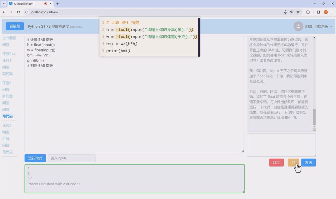 为了增强 Agent 的智能(聊天框中采用了半自动化的 ReAct 算法),我在提示词中要求 Agent 检查学生是否运行了代码,如果运行,则再将运行结果并嵌入提示词来拓宽 Agent 的感知力,以此减少幻觉。