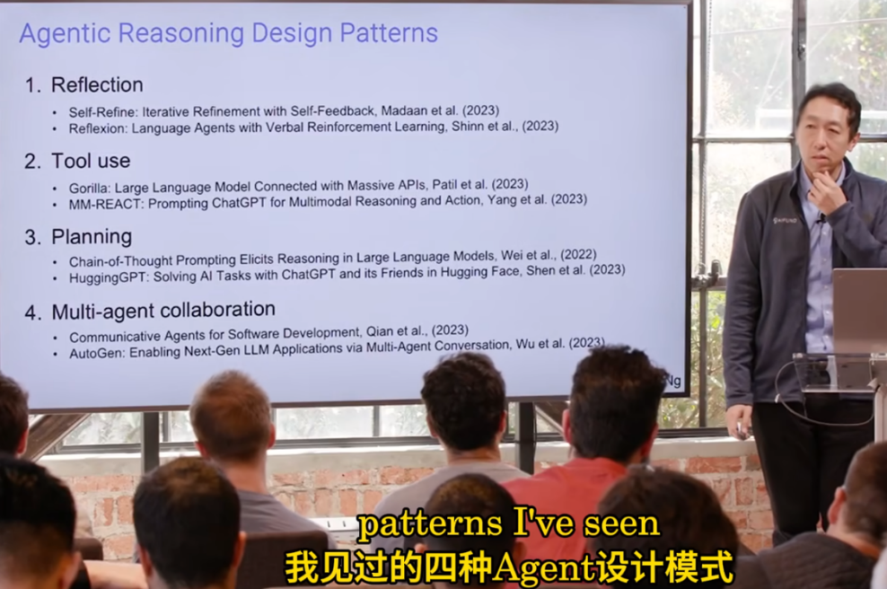 吴恩达在最近的演讲中提到 Agent 四种设计模式,分别是反思(Reflection)、工具(Tool use)、规则(Planning)、多智能体协作(Multi-agent collaboration)。
