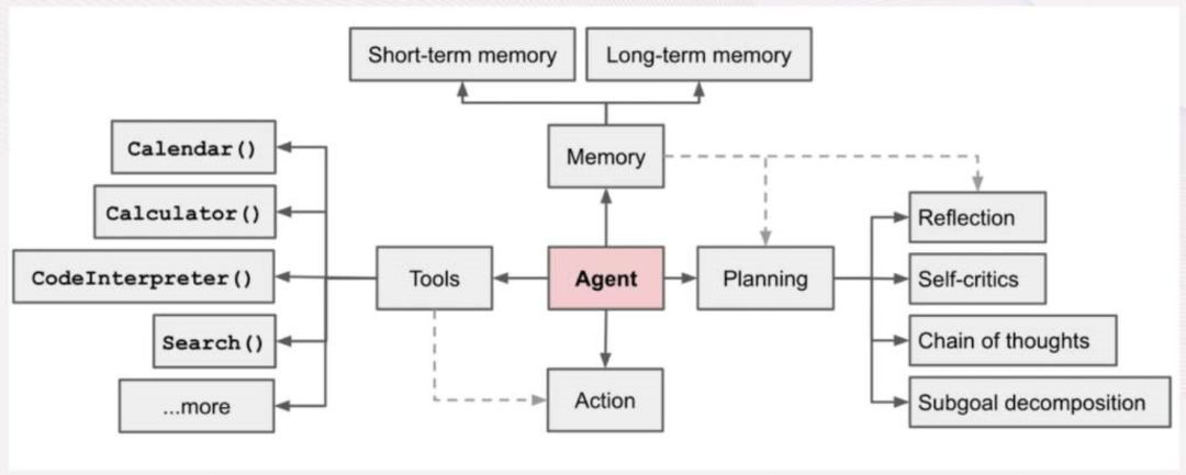 图中 Agent 拥有调用工具(Tools)的行为能力(Action),并将工具运行结果返回 Agent 的记忆力(Memory),并通过一些技巧来增强 Agent 的规划能力。