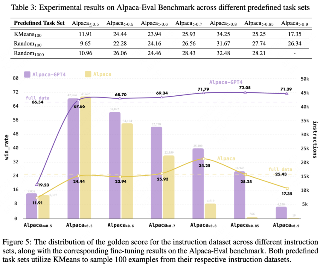 然后把Instruction Set的每一条数据都算出来他的Golder Score,从高到低排序,选top N作为最优子集即可。 结果比较惊人,在Alpaca数据中,选出top 1%的数据,就能取得和使用全部Alpaca类似的效果! 思路简单明了,但是有可以改进的地方。 首先是Predefined Task Set辅助数据集,这个随便选1000个就是最好的吗? 作者实验发现,使用Kmeans聚类100个类后,每个类别中心选1个,最后100个有代表性的效果是最好的。