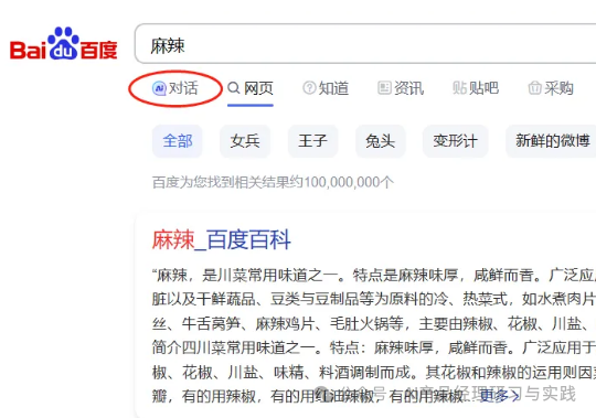 当然,实际的prompt肯定要比这个复杂,因为除了文本搜索,如前文所述还有图片搜索、视频搜索等场景,肯定要结合不同的意图差异化设计。不过有点奇怪的是,原来在百度搜索界面能看到的“AI对话”入口现在找不到了,具体出于何种考虑我还不得而知: