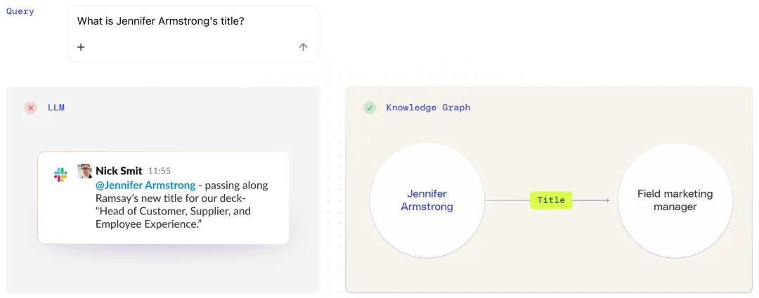在企业环境中,LLM经常在精确性方面出现问题,过度权衡术语的接近性。例如,一个虚构用户Jennifer Armstrong,现场营销经理,在最近的查询中被错误识别为客户供应商和员工体验负责人。追溯问题源头,LLM误解了她组织的一个活动的Slack消息,给她分配了错误的头衔。