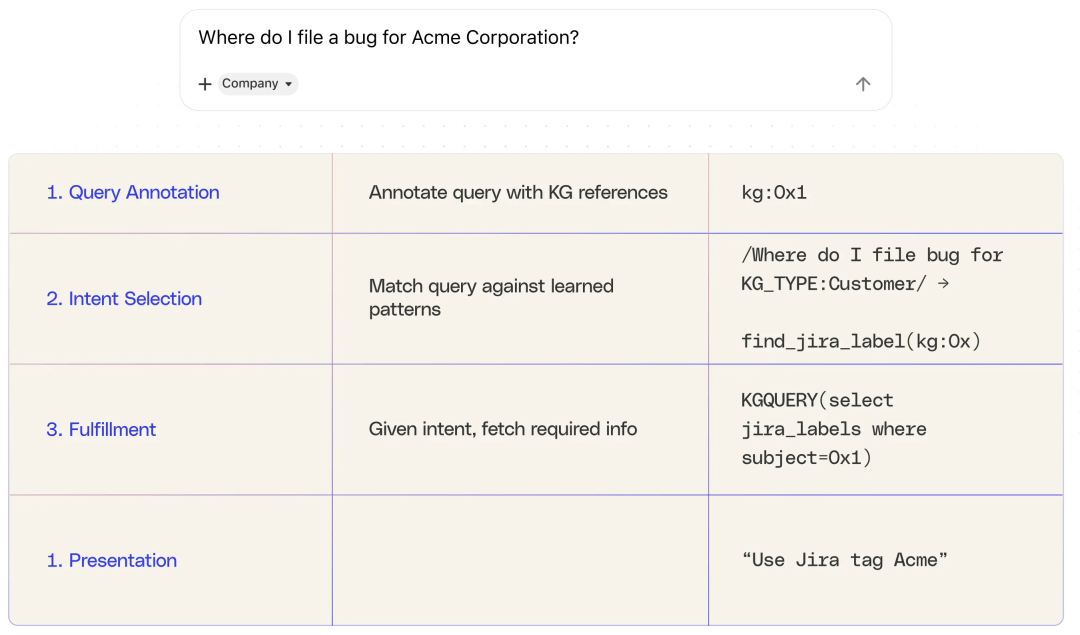 随着大语言模型(LLM)的引入,前两个阶段——实体注释和意图识别——变得更加强大和自动化。LLM擅长解析自然语言,减少了手动模式创建和基于规则的消歧需求。在Glean,我们借助LLM将图扩展到支持数千个边。
