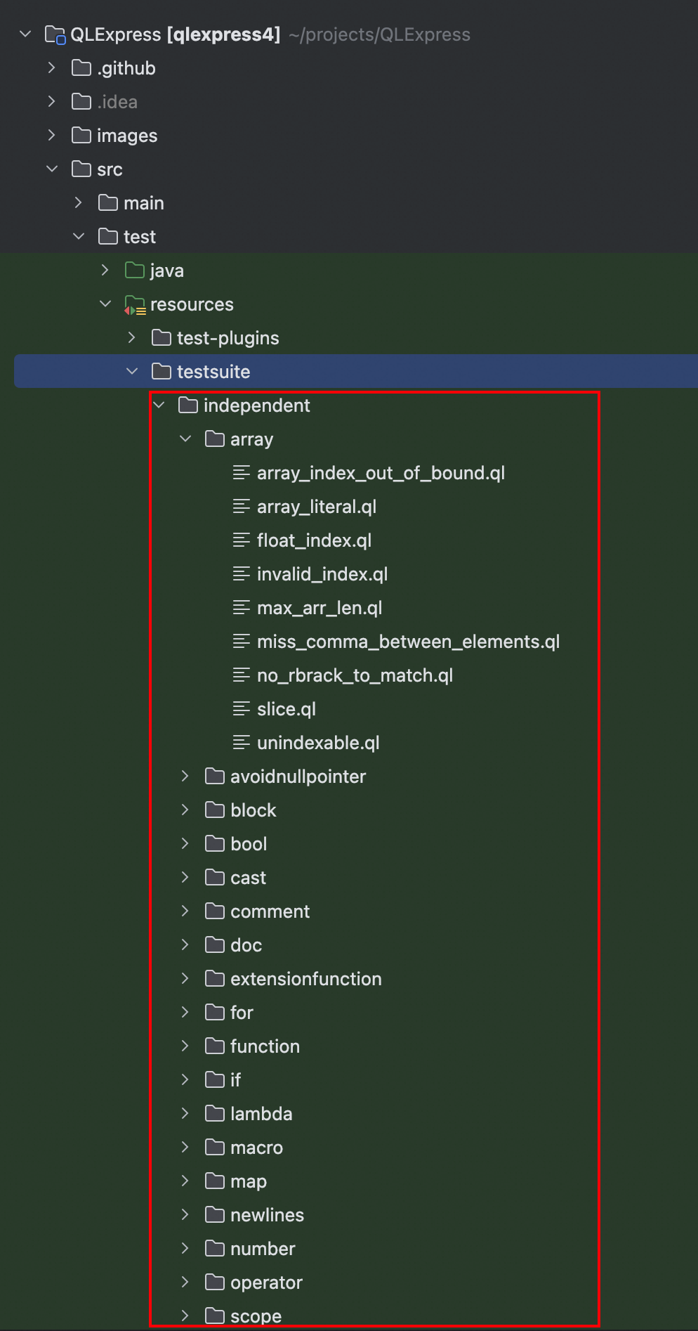 在源码的src/test/resources/testsuite目录存放了我们的测试套件,按特性划分目录,给每个特性都准备了最经典的几个测试用例,确保场景覆盖率 100%: