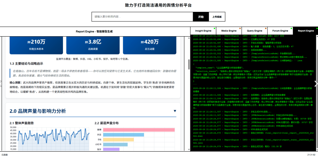 例如以 「武汉大学舆情」 为主题,系统可输出详细的品牌声誉深度分析报告,并支持查看完整运行过程视频。
