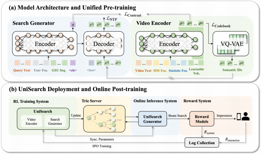 与以往依赖多阶段模型的级联系统不同,UniSearch 采用统一架构,在同一框架内完成端到端训练与推理,消除各阶段目标之间的不一致性,降低系统复杂度。