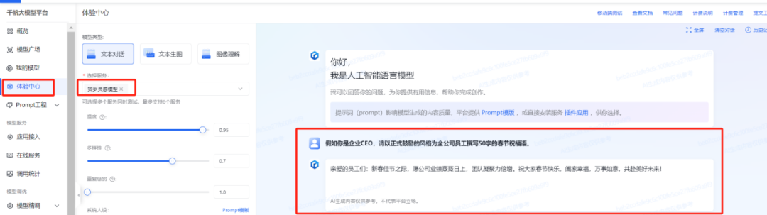 - 通过在千帆大模型平台使用平台上的各种模型调优工具,结合相关数据,基于ERNIE-Speed调优生成符合赛题主题要求且效果优秀的模型。
