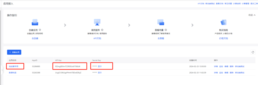 其中应用的API Key和Secret Key将在代码调用时使用。