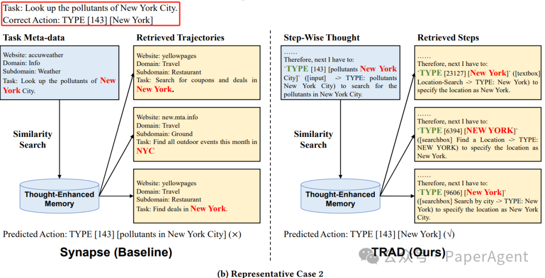 比较Synapse基于任务元数据的轨迹级检索与TRAD基于思考的步骤级检索 (a) Synapse的轨迹级检索仅考虑任务指令中的“搜索”,检索到的轨迹完全无关。然而,通过使用这些无关的轨迹生成思考,思考检索找到了与婴儿(幼儿)和导航相关的更相关的步骤级示范。(b) Synapse的轨迹级检索检索到的看似合理的例子并没有使用任务元数据在文本框中输入。尽管思考是不完美的,思考检索找到了更相关的示范,并且TRAD学会了输入“纽约”。
