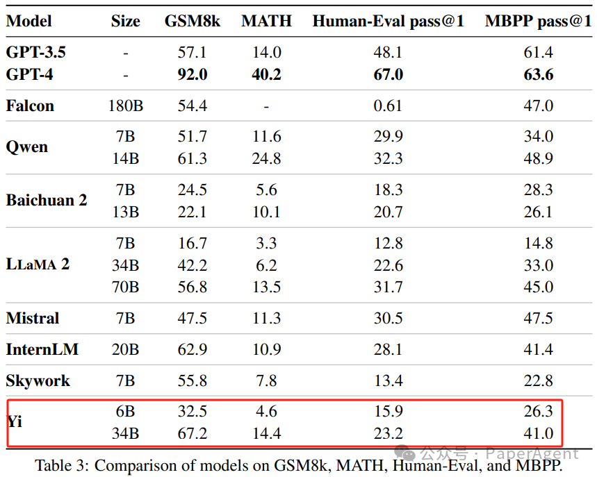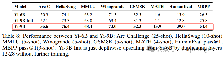 通过深度扩展,Yi-9B模型在多个基准测试中表现出色,特别是在代码、数学、常识推理和阅读理解等领域。这证明了通过优化数据特性和模型大小之间的相互作用来增强模型性能的有效性。