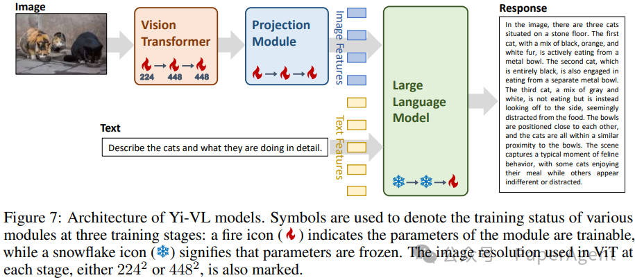 讨论了如何通过后续训练方法扩展Yi基础模型的能力,包括处理长上下文、赋予视觉理解能力,以及通过深度上扩展来增强模型。 ingFang SC", "Hiragino Sans GB", "Microsoft YaHei UI", "Microsoft YaHei", Arial, sans-serif;border-left: 4px solid rgb(248, 57, 41);line-height: 1.5em;visibility: visible;">4.1 长上下文建模为了实现对200K长上下文的支持,采用了轻量级的持续预训练和微调阶段。基本假设是,基础模型已经具备在200K输入上下文中利用信息的潜力,持续预训练阶段“解锁”了这种能力,这在针堆测试中得到了体现。然后,微调阶段进一步适应人类指令和偏好,以改善响应风格。  ingFang SC", "Hiragino Sans GB", "Microsoft YaHei UI", "Microsoft YaHei", Arial, sans-serif;border-left: 4px solid rgb(248, 57, 41);line-height: 1.5em;visibility: visible;">4.2 视觉-语言模型在多模态研究领域,将图像理解能力整合到大型语言模型中变得越来越可行。基于Yi-6B-Chat和Yi-34B-Chat语言模型的Yi视觉-语言(Yi-VL)模型。Yi-VL模型的架构包括视觉Transformer(ViT)、投影模块和大型语言模型。这些模型经过三阶段训练,以提高模型在双语多模态理解和生成方面的性能。