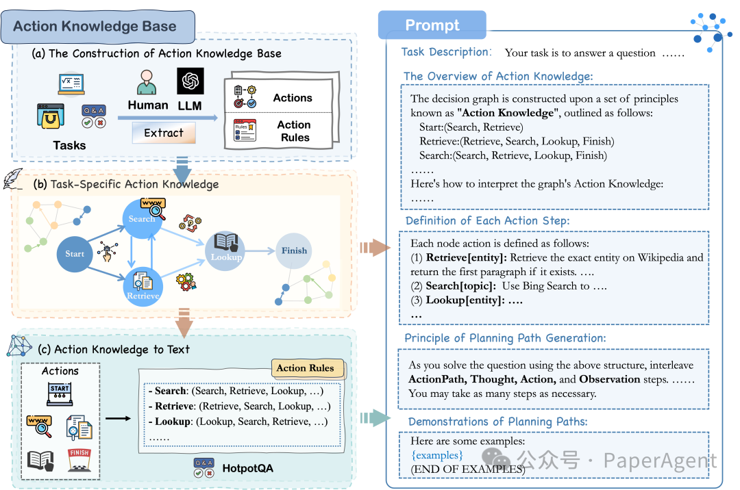 • 首先,创建了一个广泛的知识库,它融合了与特定任务相关的行动规划知识。这个数据库作为一个外部信息库,指导模型的行动生成过程。
