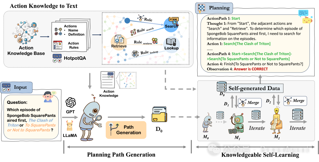 KnowAgent的框架包括三个核心部分:行动知识库的构建、行动知识到文本的转换以及规划路径的生成。KnowAgent能够引导模型生成合理的行动轨迹,并在迭代过程中不断优化模型的理解能力和应用行动知识的能力。