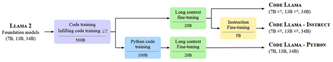 从基础模型 Llama 2(类似于 GPT-4 的仅解码器的 Transformer 模型)开始,Meta AI 使用 500B 个令牌的训练数据(主要是代码)进行了进一步训练。