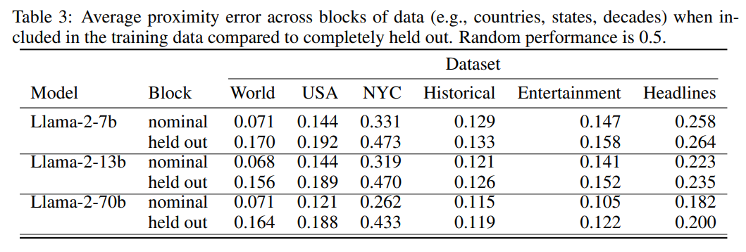 图 3:当实体名称包含在 Llama-2-70b 的不同提示中时 R2 。 在图 3 中,明确提示模型获取信息,或给出消除歧义的提示,不会影响性能。而随机分散注意力明显降低了性能。大写实体也会降低性能。对于提高性能来说,最显著的改进是句子末尾的句点标记。这表明句点可能包含了一些摘要信息,用于概括它们所在句子的内容。 6 稳健性检查6.1 通过泛化进行验证上述实验证明,可以利用模型中后层的输出通过线性变换探针计算出名称对应的时间和空间位置。然而,这种探针可能仅仅学习了模型简单特征的某种线性组合,并不一定是模型本身的能力。 为了进一步验证,作者提出了 held out 方法,即训练一系列探针,分别针对世界、美国、纽约市、历史人物、娱乐和头条新闻数据集建模。在这过程中,保留其中一个数据集不参与训练(例如,在世界范围内保留了日本的数据)。然后评估探针在保留部分数据上的表现,并将其与正常划分训练/测试数据进行比较。 图 -3 显示了 held-out 方法的平均接近误差与普通的 nominal 方法中该数据块的测试点误差进行比较,随机性能为 0.5。实验证明,尽管 held-out 方法的泛化性能受到影响,但它显然比随机更好,尤其是对于空间数据集。
