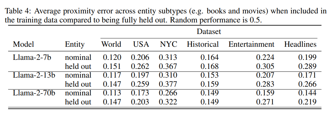 图 -4 展示了实体子类别(例如书籍和电影)识别的效果,并对比了 nominal 和 held out 的平均接近误差。结果显示,这些探针能够在实体类型之间进行泛化,唯一的例外是娱乐数据集。这也间接证明了模型以统一的方式表示不同类型的实体。