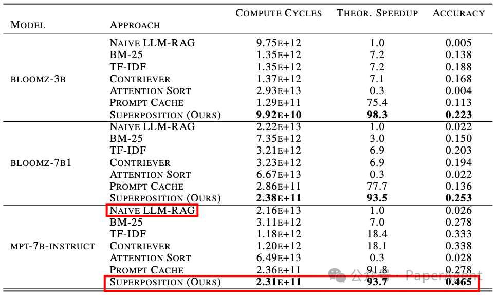 在NaturalQuestions-Open数据集上,各种模型和方法的检索增强生成准确性。对于具有超参数的基线——即BM-25、TF-IDF和Contriever的top-k参数——展示了它们最高准确性的配置。超位置提示在准确性和加速两个方面相对于考虑的基线的优越性