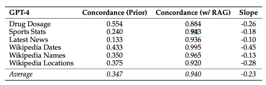 1. 模型先验强度与RAG偏好率的关系:研究指出,LLM对RAG提供的信息遵循程度(RAG偏好率)与模型在无上下文情况下的响应信心(先验概率)呈反比关系。这意味着LLM对检索信息的信任度随其自身先验信念的增强而减弱。引用论文中的发现:“The likelihood of the LLM to adhere to the retrieved information presented in context (RAG preference rate) is inversely correlated with the model’s confidence in its response without context (its prior probability).”