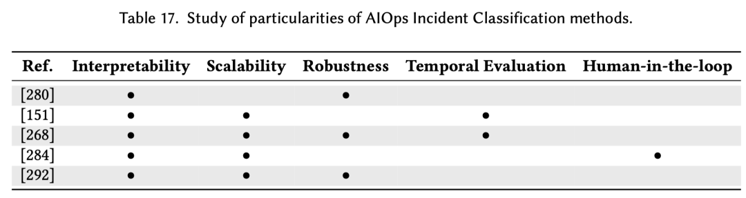 表2. 提出的用于对事件管理中的AIOps方法进行分类的分类法。