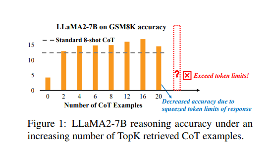 最近的研究通过增强 CoT 提示和创新基于 CoT 的训练数据,提高了 LLM 的推理能力。已经探索了提示压缩方法以解决有限的少样本示例的挑战,但它们必须有效地解决问题。提示检索方法通过选择高质量的少量示例来优化任务性能,但它们对于数学推理来说不是最优的,并且没有考虑词元冗余。LLaMA2-7B 推理的准确性随着 CoT 示例数量超过词元限制而降低。具有不同能力的 LLM 更喜欢复杂性不同的 CoT 示例,但当前的检索方法并未考虑这一点。