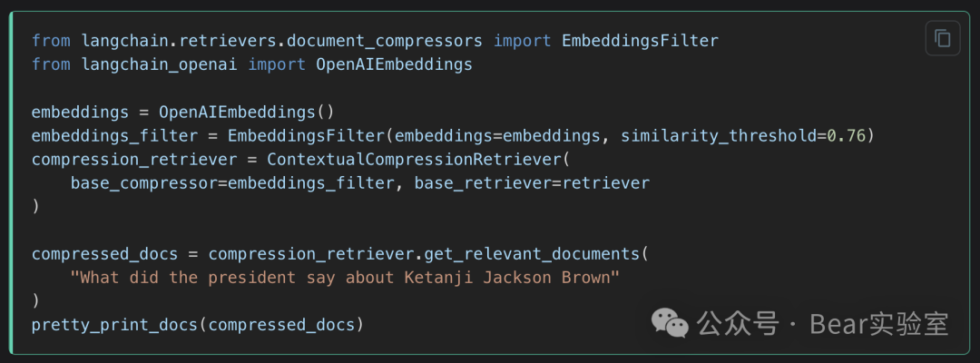 LLMChainFilter是一个简单的压缩器,使用LLM链来决定最初检索到的文档中的哪些要过滤掉,哪些要返回,而无需操作文档内容。嗯。。。这个,我就是因为不想调用LLM费钱处理才采用这个方案的吗?EmbeddingsFilter通过嵌入文档和查询并只返回那些与查询具有足够相似嵌入的文档,提供了一个更便宜、更快的选项。