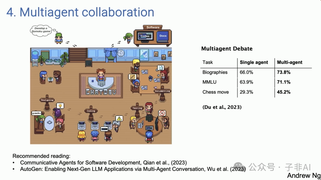 多个AI代理可以协同工作,完成更复杂的任务。例如,ChatDev项目中的多个代理可以模拟软件开发团队,协作开发游戏。