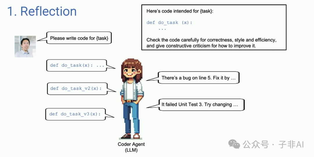 AI代理可以评估自身的输出,并根据评估结果进行改进。例如,代码代理可以检查自己生成的代码并修复错误。