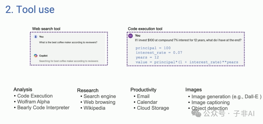 AI代理可以利用现有的工具和模型来完成任务。例如,LLM可以利用搜索引擎、代码生成器等工具来获取信息和执行操作。