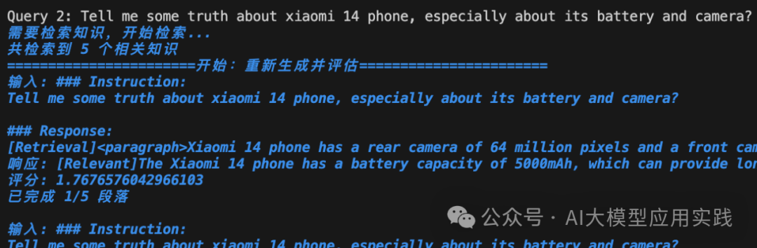 returnllm_response_text, paragraphs_final_score 这样就构建了一个简单的Self-RAG范式的应用,直接运行就可以看到上面两个测试问题的处理过程及区别: