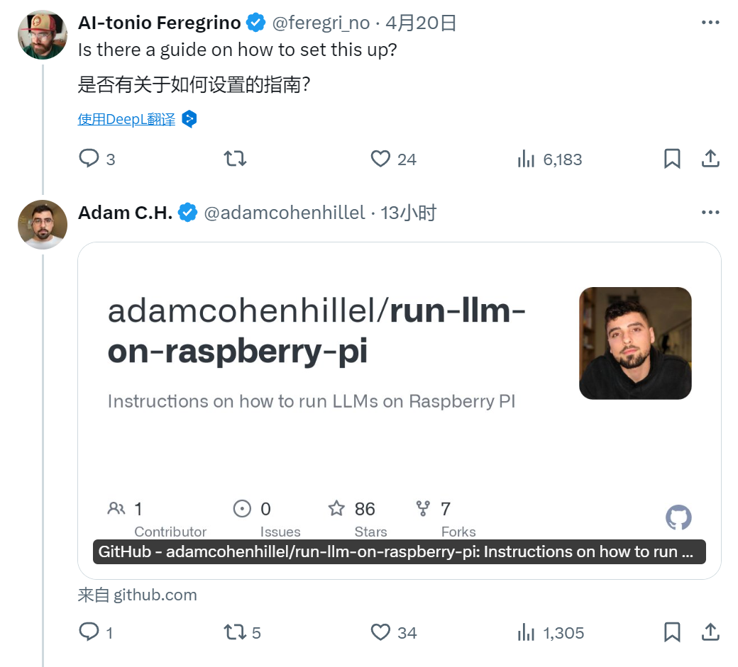 如何在树莓派 5 上跑出 Llama 3 8B,@adamcohenhillel 并未给出详细步骤,但他推荐了在树莓派 5 上运行 Mistral 7B 的操作指南,可以如法炮制。