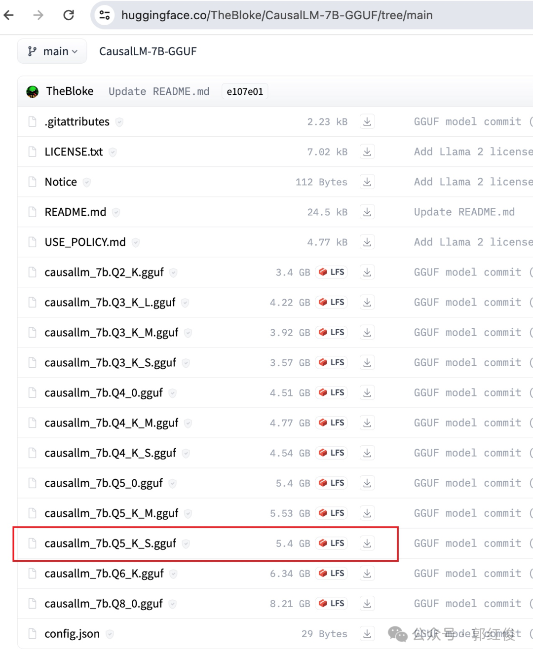 我们这里使用:causallm_7b.Q5_K_S.gguf模型文件,作者对这个版本的评价是:large, low quality loss - recommended