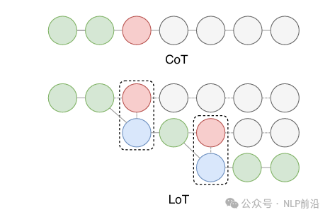 cot的图对比lot(logical thought),绿色的表示实际路线,蓝色的节点表示抉择胜利的节点。
