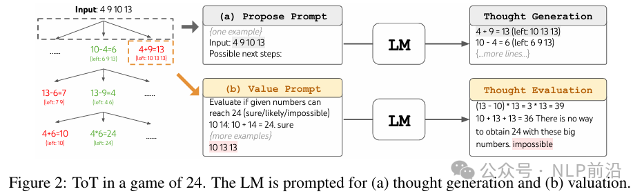 论文是《Tree of Thoughts: Deliberate Problem Solving with Large Language Models》 与链的差异如下图,前面提到的多词投票得到的cot-sc策略,就类似于只在根节点分叉的树,后面一直走到叶子节点。tree ot thoughts(tot),则是在每一层都可能有不同的选择。在每一步会存在一个value函数,来决策每个节点到当前的路径价值。这个价值函数可以通过投票或者提示词模板生成来实现。最后就是通过dfs,或者bfs来搜索了。
