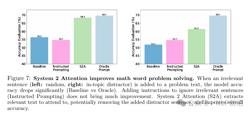 一些测试如下图,浅蓝色条条 orade prompt是指无干扰的prompt,左右2边分别对应随机添加一些噪声文本进去、添加一些主题相关的噪声进去,粉色的instructed prompting指在提示词中添加,忽略无关句子的指令。baseline与orade prompt对比,说明大模型的结果会很大程度收到不相关上下文的干扰,尤其是来自相同领域的噪声,影响会更明显。而system2attention方法可以大幅提高这个鲁棒性,尽管在右图,添加主题相关噪声时,打不过无噪声情况。