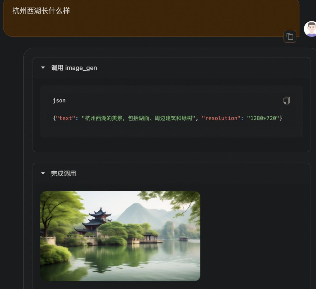 我们在服务部署后,可以在AgentFabric中校验其接口调用效果,以天气查询为例,可以看到: