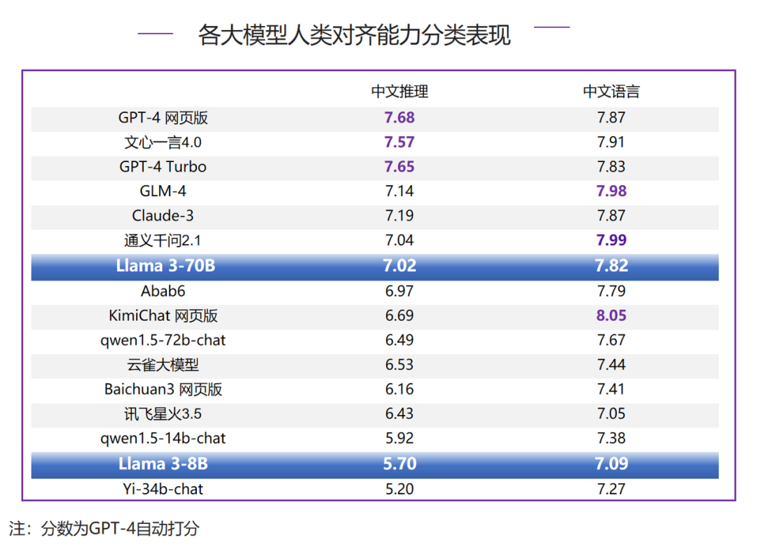 Llama 3-70B在中文推理评测中排名第7,和第一梯队的GPT-4系列模型以及文心一言4.0相差约0.6分;在中文语言评测中排名第8,但是和GPT-4系列模型、Claude-3分差较小,处于同一梯队,和榜首的KimiChat网页版也只有0.23分的差距。